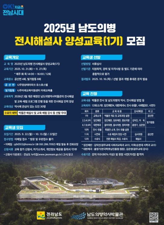 (포탈뉴스통신) 전라남도는 2026년 3월 개관 예정인 남도의병역사박물관에서 활동할 전시해설사와 교육·체험 강사 양성을 위해 오는 10월 13일까지 교육생 30명을 모집한다고 밝혔다.