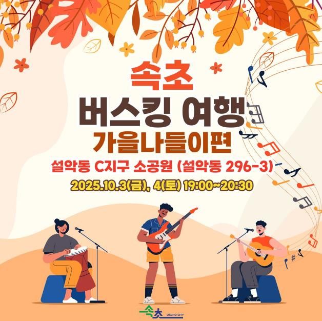 (포탈뉴스통신) 속초시가 추석 연휴의 시작과 함께 시민과 관광객에게 특별한 문화예술 향유 기회를 선사하기 위해 ‘속초 버스킹 여행-가을나들이편’을 오는 10월 3일, 4일 오후 7시부터 8시 반까지 설악동 C지구 소공원에서 선보인다.
