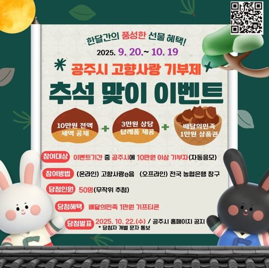 (포탈뉴스통신) 공주시는 추석을 앞두고 고향사랑기부 모금 활성화를 위해 ‘추석맞이 이벤트’를 진행한다고 29일 밝혔다.
