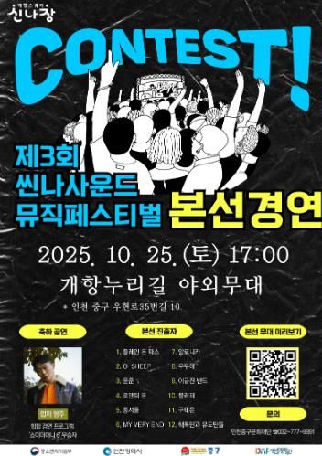 (포탈뉴스통신) (재)인천중구문화재단은 오는 10월 25일 오후 5시 인천 중구 개항누리길 야외무대에서 ‘제3회 씬나사운드 뮤직 페스티벌’ 본선 경연을 개최한다고 밝혔다.