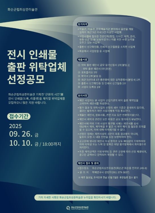 (포탈뉴스통신) 화순군은 29일 화순군립최상준미술관 기획전 ‘근원의 시간’ 展의 전시 인쇄물(도록, 리플렛) 제작을 전문적으로 수행할 위탁업체를 공개 모집한다고 밝혔다.
