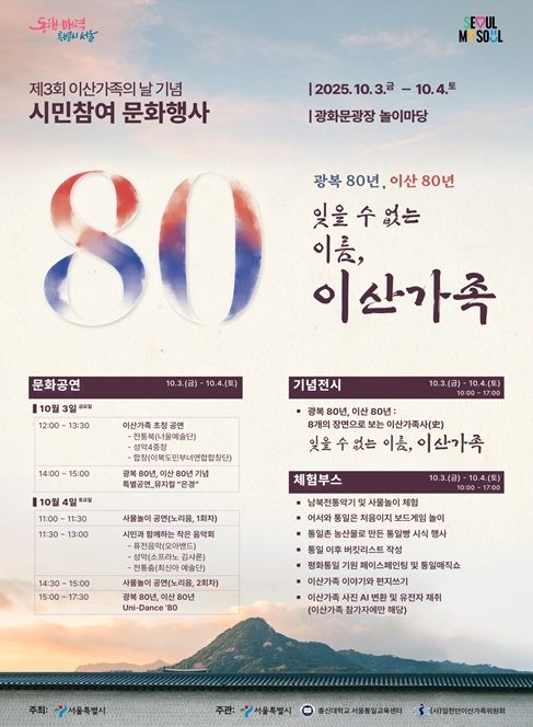 (포탈뉴스통신) 서울시는 오는 10월 3일부터 10월 4일까지 광화문광장 놀이마당에서 제3회 이산가족의 날을 맞아 시민참여 문화행사를 개최한다.