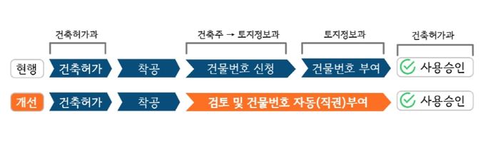 그동안 건축주는 건물 신축 시 건축법에 따라 건축 담당 부서에 착공신고를 한 후 도로명주소법에 따라 주소 담당 부서에 건물번호 부여를 별도로 신청해야 했다.