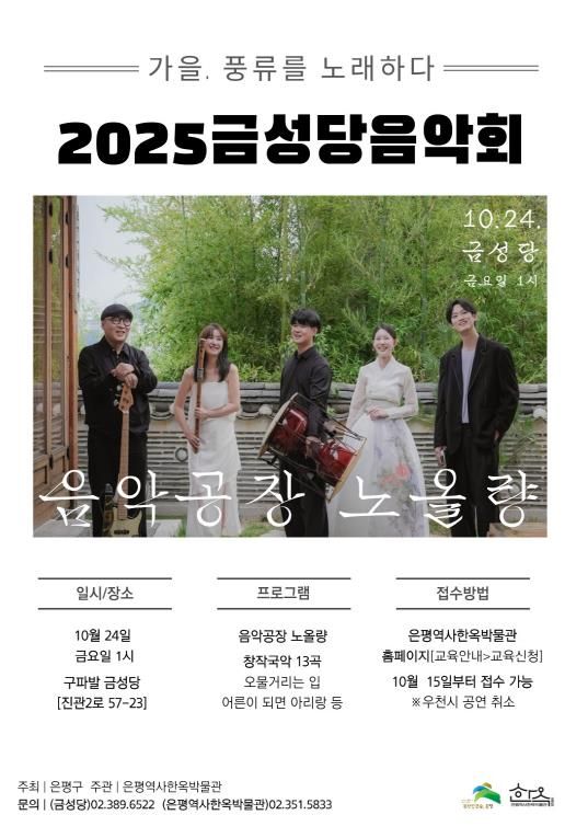 이번 음악회는 은평구 관광활성화 주간을 맞아 지역의 소중한 문화유산을 활용해 전통문화를 널리 알리고, 주민과 관람객이 함께 어울릴 수 있는 문화 교류의 장을 마련하기 위해 기획됐다.