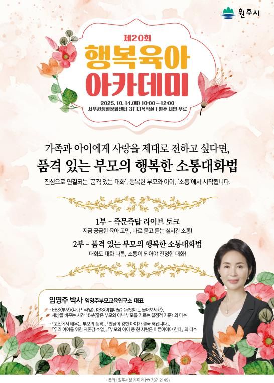 (포탈뉴스통신) 원주시는 10월 14일 오전 10시, 서원주생활문화센터 3층 임영주 임영주부모교육연구소 대표와 함께 ‘제20회 행복육아 아카데미’를 개최한다.