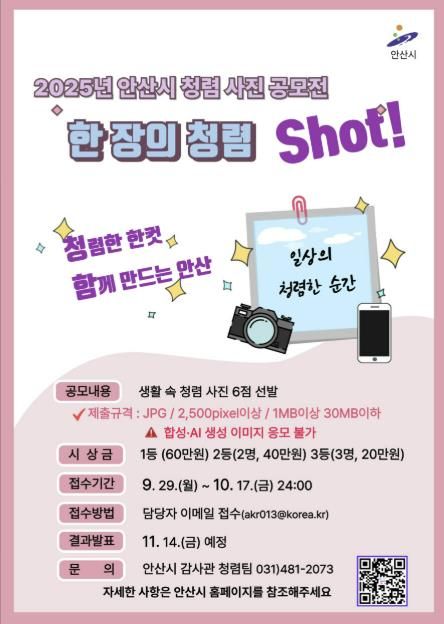 (포탈뉴스통신) 안산시는 청렴문화 확산과 시민 공감대 형성을 위해 ‘2025 한 장의 청렴, Shot! 사진 공모전’을 개최한다고 30일 밝혔다.