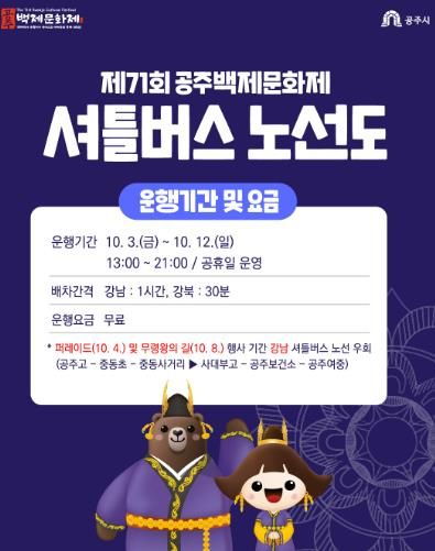 (포탈뉴스통신) 공주시는 오는 10월 3일부터 12일까지 열리는 ‘제71회 백제문화제’ 기간 동안 관람객들의 원활한 이동을 돕기 위해 무료 셔틀버스를 운영한다고 밝혔다.