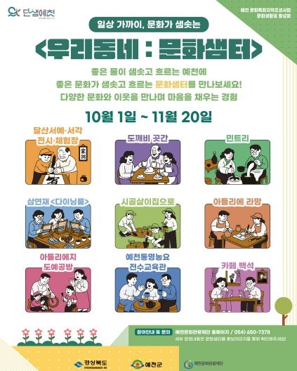 ‘우리동네: 문화샘터’와 관련한 자세한 사항은 예천문화관광재단 홈페이지 또는 ☎ (054-650-7378)로 확인할 수 있다.