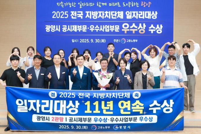 (포탈뉴스통신) 광양시는 9월 30일 청주 오스코에서 열린 고용노동부 주관 '2025년 전국 지방자치단체 일자리대상' 시상식에서 공시제 부문과 우수사업 부문 모두 우수상을 수상하며, 2015년부터 11년 연속 수상이라는 값진 성과를 거뒀다고 밝혔다.