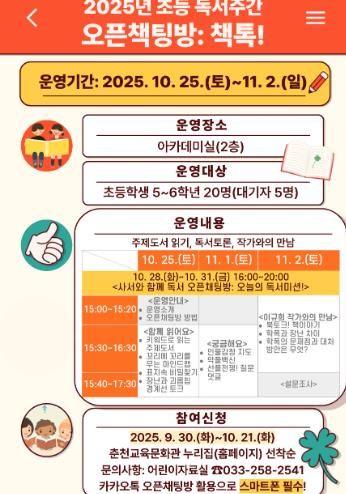 (포탈뉴스통신) 춘천교육문화관은 책 읽기 좋은 계절인 가을을 맞아 오는 10월 25일, 10월 28일부터 11월 2일까지 초등학생 5~6학년 학생 20명을 대상으로 초등 독서주간 ‘오픈책팅방 책톡!’을 운영한다.