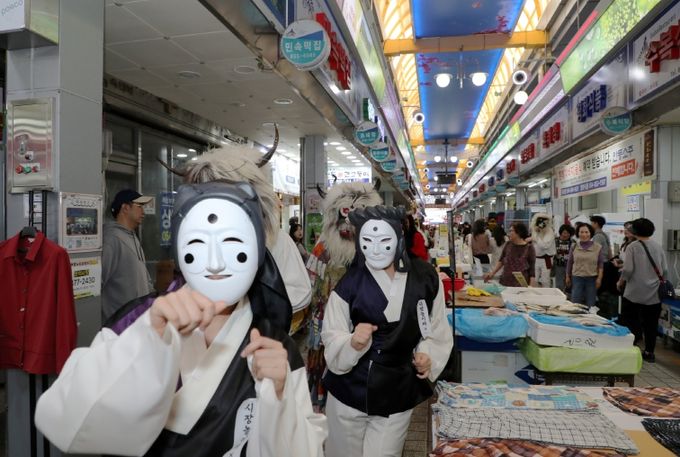 퍼레이드에는 ‘조선시대 상인’을 모티프로 한 시장놀이패와 해외 공연단, 지역 상인들이 함께 참여한다. 참가자들은 전통 탈과 의상을 착용하고 거리 행렬을 이루며, 시장 곳곳에서 시민과 관광객이 어깨춤을 추고 함께하는 대동난장을 펼친다.