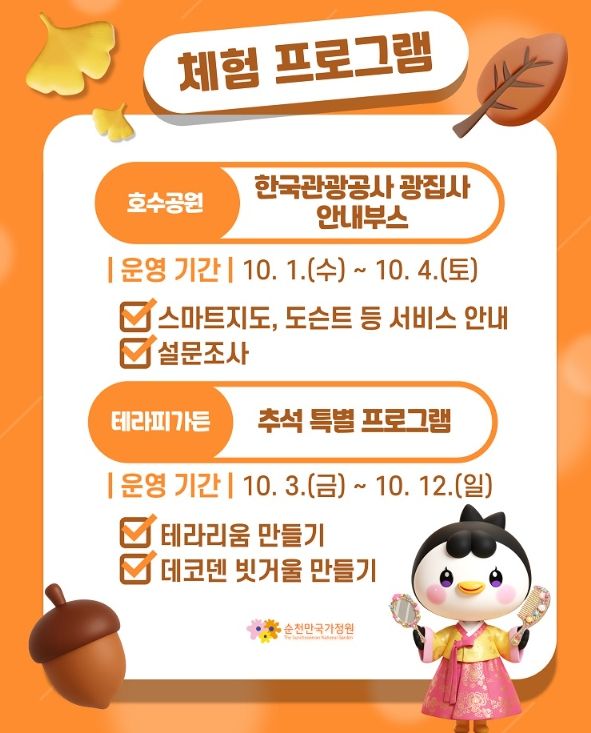 이번 한가위 특별 프로그램은 자연과 함께하는 생태‧예술 교육으로 정원의 가치를 알리고, 전통 공연과 놀이, 한복데이 같은 문화 프로그램은 국가정원의 문화적 공간성이 더욱 확장되는 계기가 될 예정이다.