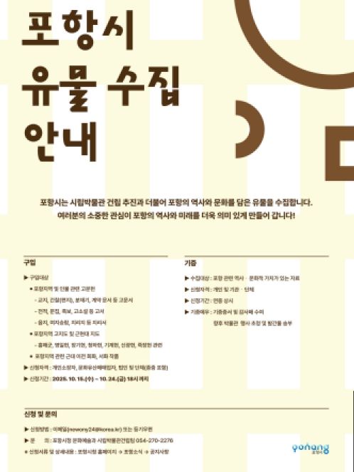 포항시 관계자는 “이번 유물 수집은 시립박물관 건립을 위한 첫걸음이자 시민의 기록과 기억을 담는 중요한 계기가 될 것”이라며 “많은 시민들의 적극적인 참여를 부탁드린다”고 말했다.