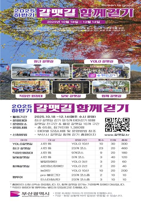(포탈뉴스통신) 부산시는 오는 10월 18일부터 12월 14일까지 두 달여 간 '2025년 하반기 욜로(YOLO) 갈맷길 함께 걷기 행사'를 운영한다고 밝혔다.