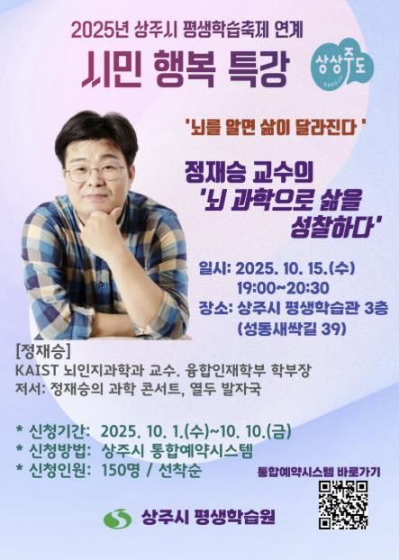 (포탈뉴스통신) 상주시 평생학습원은 2025. 10. 15. 오후 7시부터 8시30분까지 상주시 평생학습관 3층 강당에서 뇌과학자이자 미래학자인 정재승 KAIST 교수를 초청하여 특별 강연을 진행한다.