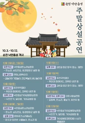 (포탈뉴스통신) 순천시는 순천 낙안읍성에서 '주말 상설공연'과 '김빈길 장군 창극' 공연을 오는 10월 3일부터 12일까지 선보인다고 밝혔다.