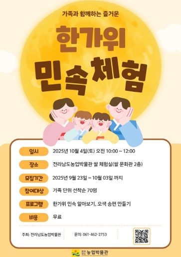 (포탈뉴스통신) 전라남도 농업박물관은 다가오는 한가위를 맞아 가족 단위 관람객 대상으로 ‘한가위 민속 체험행사’를 10월 4일에 개최한다고 밝혔다.