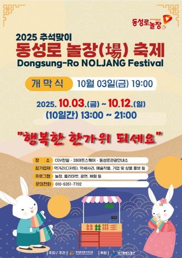 (포탈뉴스통신) 대구 중구는 10월 3일부터 12일까지 10일간 동성로 보행자전용도로 일원에서 ‘동성로에서 놀며 장보자!’라는 테마로 ‘2025 추석맞이 동성로 놀장(場) 축제’를 개최한다.