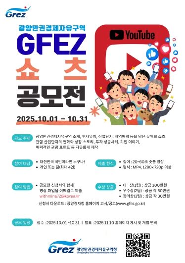 (포탈뉴스통신) 광양만권경제자유구역청(청장 구충곤)은 10월 1일부터 31일까지 국민 참여형 ‘2025 GFEZ 유튜브 쇼츠 공모전’을 개최한다고 밝혔다.