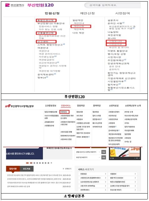 보다 자세한 내용은 각 기관(부산민원120, 소방재난본부, 상수도사업본부) 누리집 공지사항을 통해 확인할 수 있으며, 전화 문의는 시 통합민원과로 하면 된다.