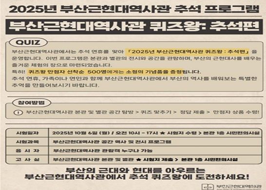 부산근현대역사관은 추석 연휴를 맞아 오는 10월 6일 오전 10시부터 오후 5시까지 시민참여 프로그램 '2025년 부산근현대역사관 퀴즈왕: 추석날편'을 운영한다고 밝혔다.