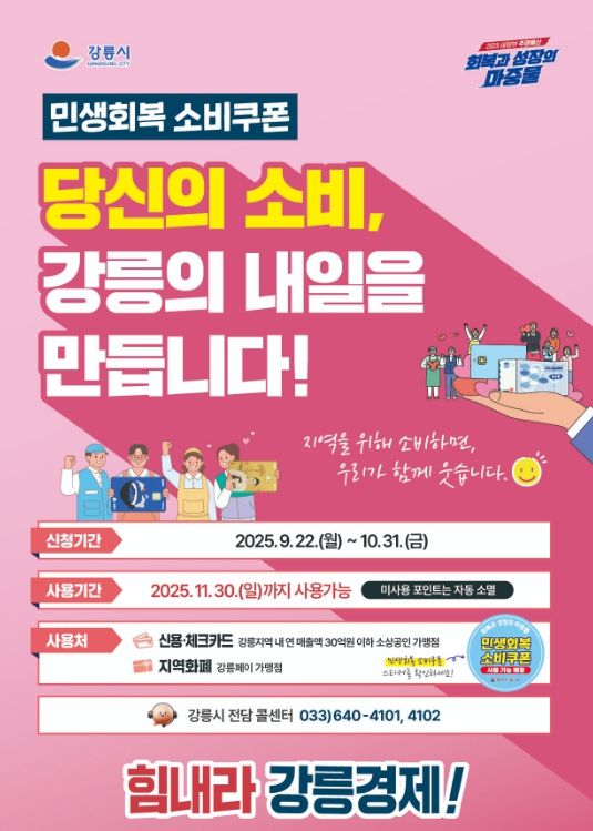 (포탈뉴스통신) 강릉시 민생회복 소비쿠폰 2차 신청·지급률이 85%로 순항 중인 가운데, 시는 1일부터 10일까지 민생회복 소비쿠폰 2차 소비촉진주간을 운영한다.