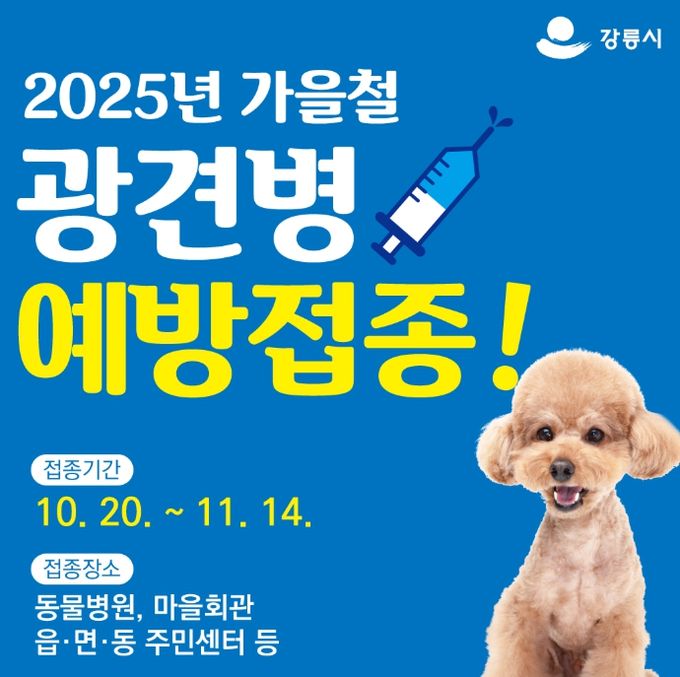 (포탈뉴스통신) 강릉시는 인수공통전염병으로 알려진 광견병으로부터 시민과 반려동물을 안전하게 보호하기 위해 오는 10월 20일부터 11월 14일까지 4주간 가을철 광견병 예방접종을 실시한다.