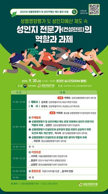 (포탈뉴스통신) 강원특별자치도여성가족연구원에서는 9월 30일 오후 1시 30분, 온라인 실시간(ZOOM활용)으로 ‘2025년 성별영향평가 및 성인지예산 제도 발전 포럼’을 개최했다.