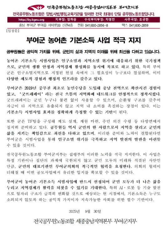 (포탈뉴스통신) 전국공무원노동조합 부여군지부는 지난 9월 30일 의견문을 통해, 부여군이 추진 중인 농어촌 기본소득 시범 사업을 적극적으로 지지하며, 군민과 함께 공모사업 유치에 최선을 다하겠다는 뜻을 밝혔다.