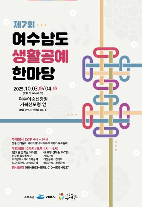 (포탈뉴스통신) 여수시는 추석 연휴인 10월 3일부터 4일까지 이틀간 해양공원 소녀상 인근에서 ‘제7회 여수 남도 생활공예 한마당’을 개최한다.