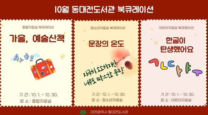 (포탈뉴스통신) 동대전도서관은 가을 독서의 계절을 맞아 10월 한 달간 연령별 맞춤 주제 북큐레이션 전시를 운영한다고 10일 밝혔다.
