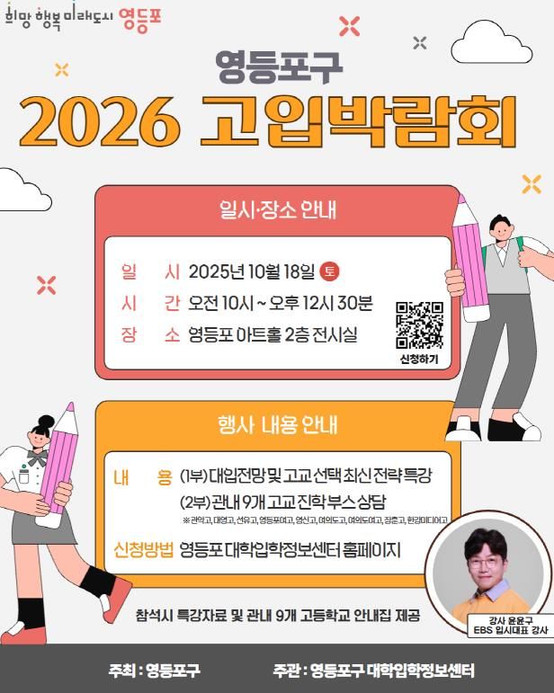 아울러 오는 11월 22일 영등포 아트홀에서는 ‘2026 대입 정시 지원전략 설명회’를 개최할 예정이다. 행사와 관련한 자세한 사항은 ‘영등포 대학입학센터’ 또는 구청 미래교육과로 문의하면 된다.