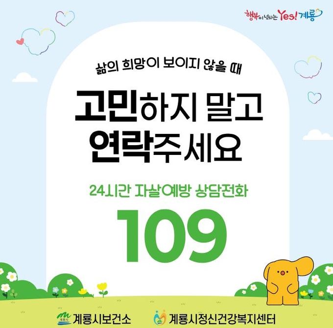 언제든지 정신적 어려움과 위기 상황에 놓인 주민들은 24시간 자살 예방 상담전화(☎109)로 연락하면 도움을 받을 수 있다.