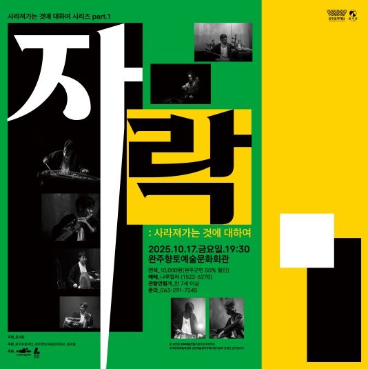 (포탈뉴스통신) 전북 완주군에 깊어가는 가을밤, 사라져가는 토속 민요의 숨결을 현대적인 감각으로 재조명하고 재해석한 특별한 국악 공연이 펼쳐진다. 완주문화재단은 오는 10월 17일, 완주향토예술문화회관에서 국악앙상블 불세출의 '자락: 사라져가는 것에 대하여' 공연을 개최한다