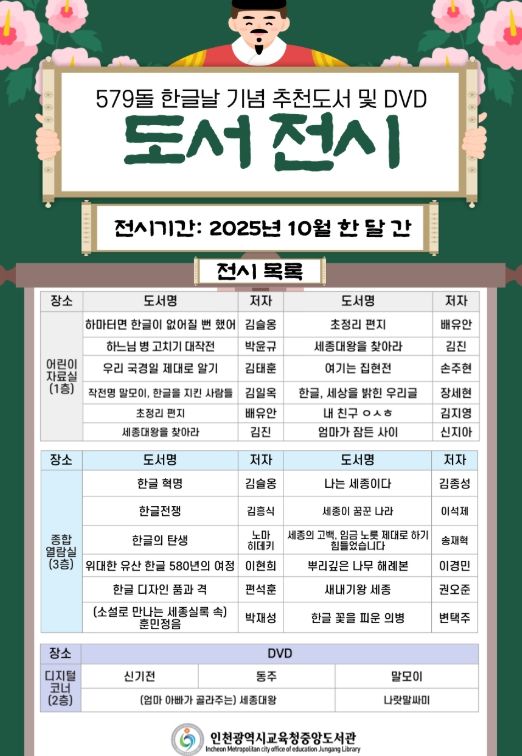 (포탈뉴스통신) 인천광역시교육청중앙도서관은 한글 창제 579돌을 기념해 10월 한 달 동안 ‘한글날 추천 도서 및 DVD’ 전시를 운영한다.