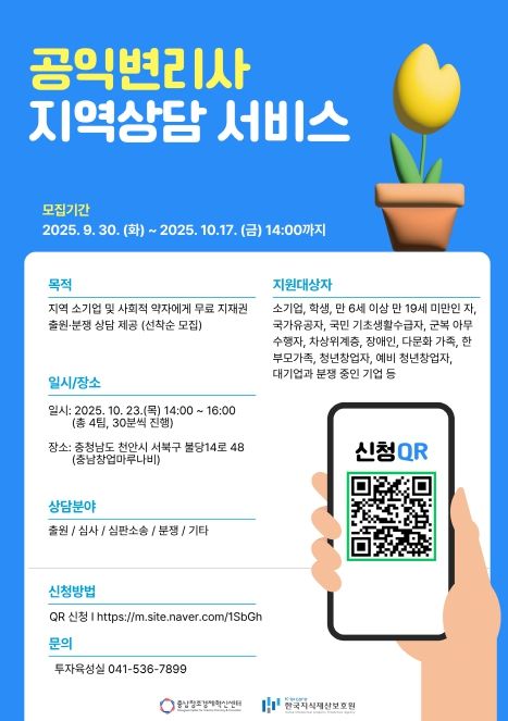 충남혁신센터 관계자는 “이번 공익변리사 상담 서비스가 지식재산권 확보와 보호에 어려움을 겪는 창업자들에게 실질적인 도움이 되기를 기대한다”며, “충남지역 스타트업이 경쟁력을 갖추고 성공적으로 성장할 수 있도록 지식재산 분야 전문 지원을 지속적으로 강화해 나가겠다”고 밝혔다.