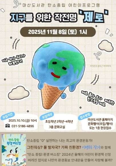 (포탈뉴스통신) 김포시 마산도서관에서 오는 11월 8일 오후 1시부터 3시까지, 초등학교 2학년~4학년 어린이를 대상으로 탄소중립 어린이 프로그램 책풍당당 '지구를 위한 작전명 ‘제로’'를 운영한다.