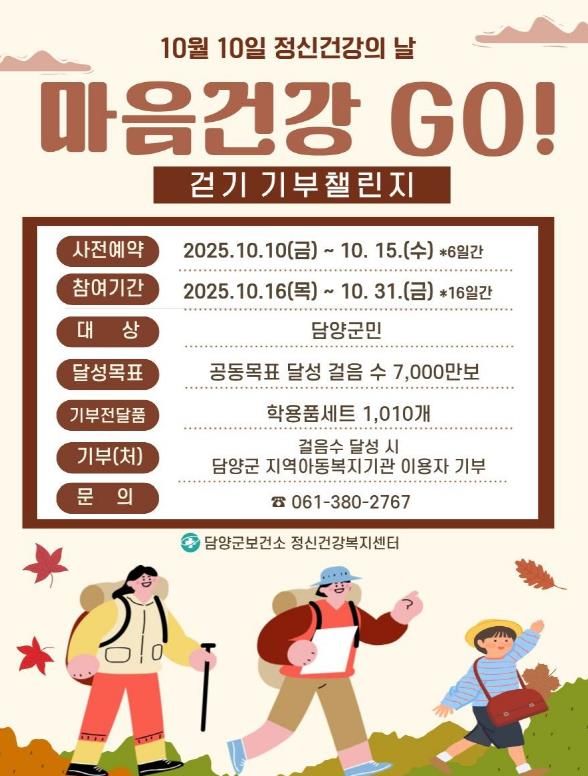 (포탈뉴스통신) 담양군은 10월 10일 ‘세계 정신건강의 날’을 맞이하여 전 군민을 대상으로 걷기 기부 챌린지를 운영한다고 밝혔다.