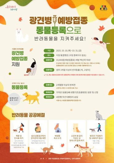 (포탈뉴스통신) 구로구가 이달 16일부터 31일까지 가을철 반려동물 광견병 예방접종을 실시한다.