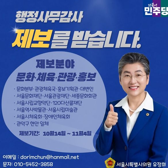 (포탈뉴스통신) 서울특별시의회 문화체육관광위원회 유정희 의원(더불어민주당, 관악4)은 10월 14일부터 11월 4일까지 시민 의견을 직접 접수받는 ‘행정사무감사 시민제보창구’를 운영한다고 밝혔다.