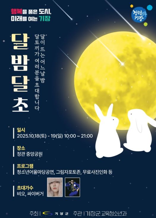 (포탈뉴스통신) 기장군은 오는 18일부터 19일까지 정관읍 중앙공원 일원에서 2025 기장군청소년어울마당 ‘달밤달초’를 개최한다고 15일 밝혔다.