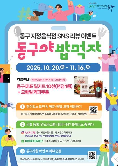 (포탈뉴스통신) 대구 동구청은 지정음식점 홍보와 외식산업 활성화를 위해 20일부터 11월 16일까지 4주간 ‘동구 지정음식점 홍보 SNS 인증샷 & 리뷰 이벤트’를 실시한다.