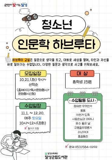 참여 대상은 중학생이며, 신청은 10월 21일 오전 9시부터 달성군립도서관 홈페이지를 통해 선착순으로 진행된다.