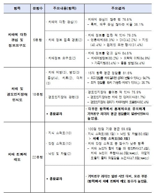이번 조사는 ▴치매에 대한 관심 및 정보요구도(3개 항목-5문항) ▴치매 및 경도인식장애 인식도(6개 항목-18문항) ▴치매 친화적 태도(3개 항목-22문항) 등 총 45개 문항으로 진행됐다. 특히 올해부터는 더욱 정밀한 분석을 위해 경도인지장애 인식도(3문항)를 추가하고 별도로 수행했던 치매 친화적 태도(22문항)를 함께 진행했다.