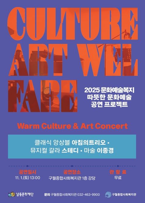 (포탈뉴스통신) 인천시 남동구 남동문화재단은 구월종합사회복지관과 협력해 오는 11월 1일 오후 1시부터 구월종합사회복지관 1층 강당에서 가족 특화 문화예술복지 공연을 운영한다고 30일 밝혔다.