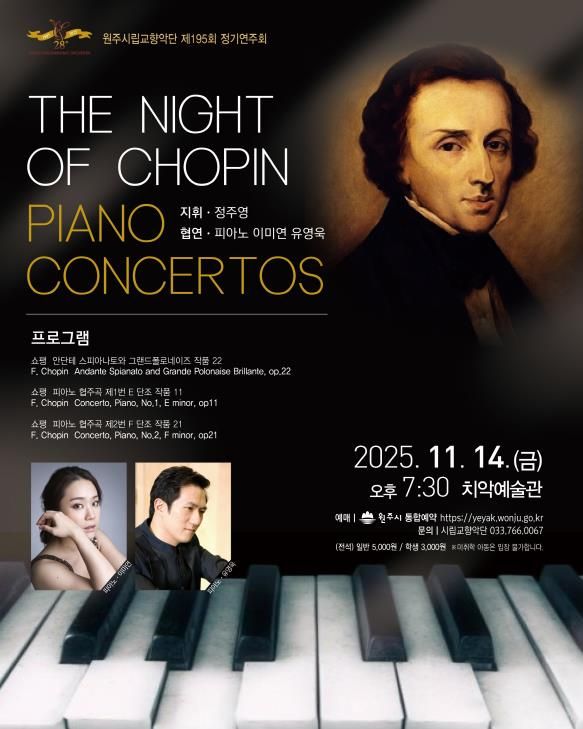 (포탈뉴스통신) 원주시립교향악단은 오는 14일 오후 7시 30분, 치악예술관에서 제195회 정기연주회 ‘The Night of CHOPIN’을 개최한다.