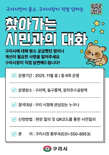백경현 구리시장은 “시민이 생활 속에서 느끼는 불편과 건의 사항을 현장에서 직접 듣고, 시장과 공직자가 함께 해결 방안을 모색하는 열린 행정을 실현하겠다”라며“앞으로도 시민이 체감할 수 있는 현장 중심의 소통 기회를 지속적으로 확대하겠다”라고 말했다.