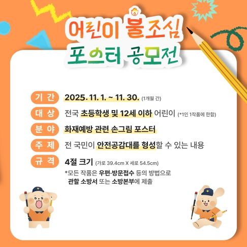 (포탈뉴스통신) 해남소방서가 11월 불조심 강조의달을 맞아 이달 21일까지 지역 내 초등학생 및 12세 이하 어린이를 대상으로 불조심 포스터 공모전을 개최한다.