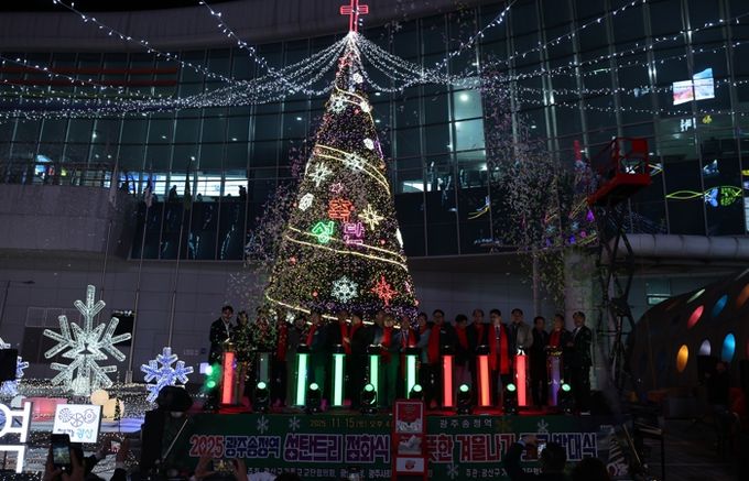 광산구에 따르면, 지난 15일 ‘2025년 성탄(크리스마스) 트리’ 점화식과 함께 광주송정역 광장에 조성한 ‘12월 가장 예쁜 역’이 불을 밝혔다.