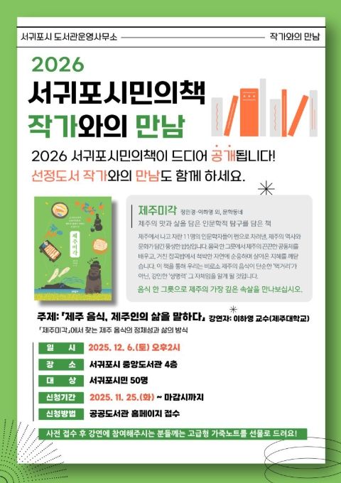 (포탈뉴스통신) 서귀포시는 12월 6일 오후 2시, 서귀포시 중앙도서관에서 2026년 서귀포시민의 책으로 선정된 '제주미각'의 저자 이하영 교수를 초청해 작가와의 만남을 운영한다.